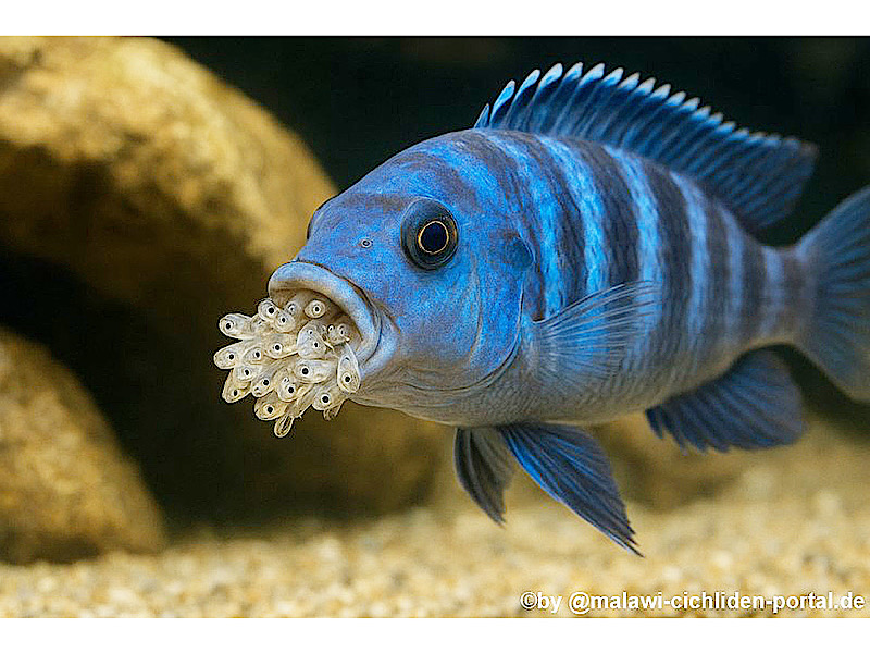 Malawi-Cichliden aus dem Malawisee gehören zu den Maulbrütern. Nach der Eiablage nimmt das Weibchen die befruchteten Eier direkt ins Maul und trägt sie dort sicher zwischen den Kiemenbögen. Während dieser Zeit frisst das Weibchen oft nur wenig oder gar nicht, da ihr Hauptziel darin besteht, den Nachwuchs zu schützen.